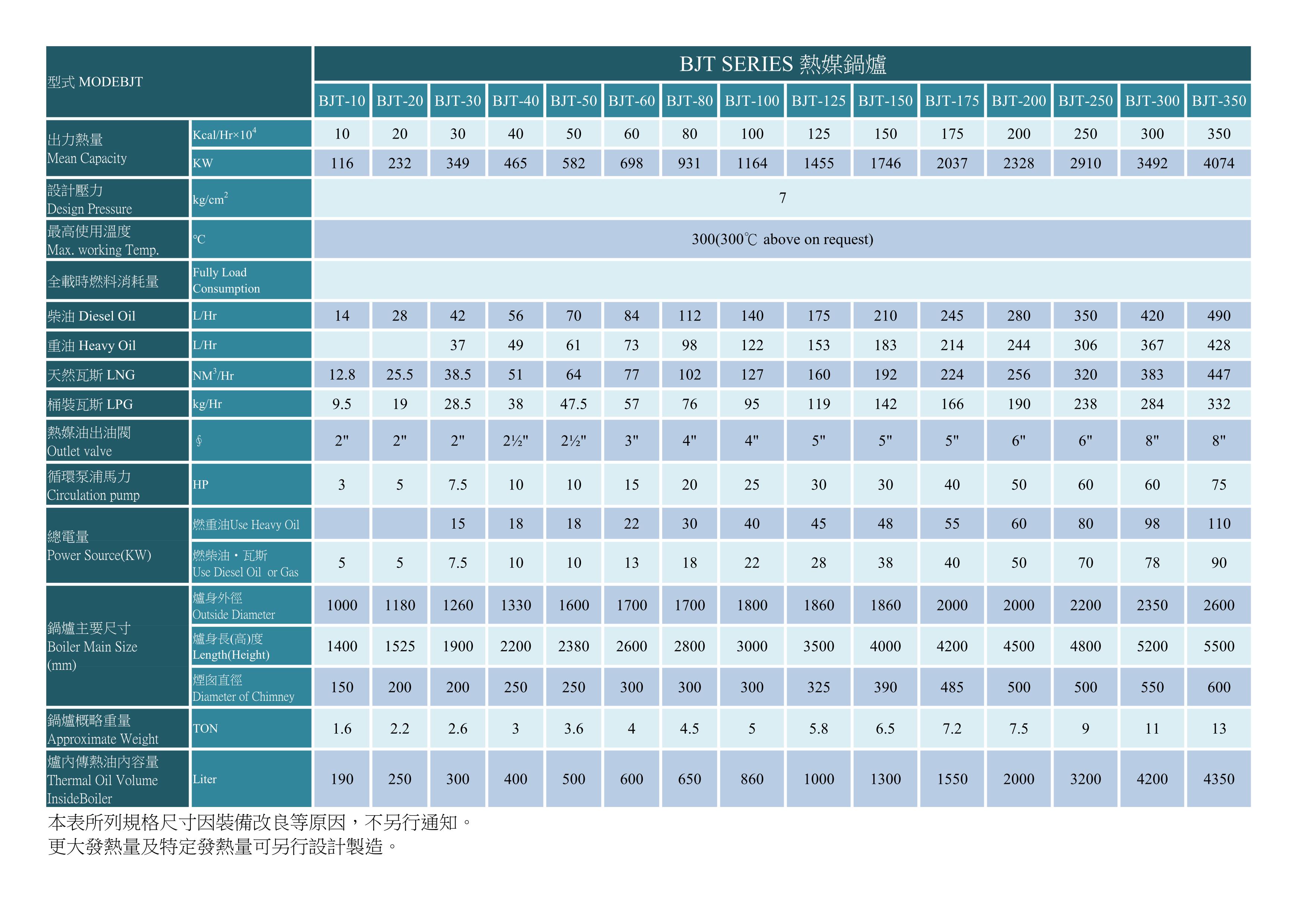 *另有(瓦斯/柴油)、(柴油/重油) 雙燃料機種